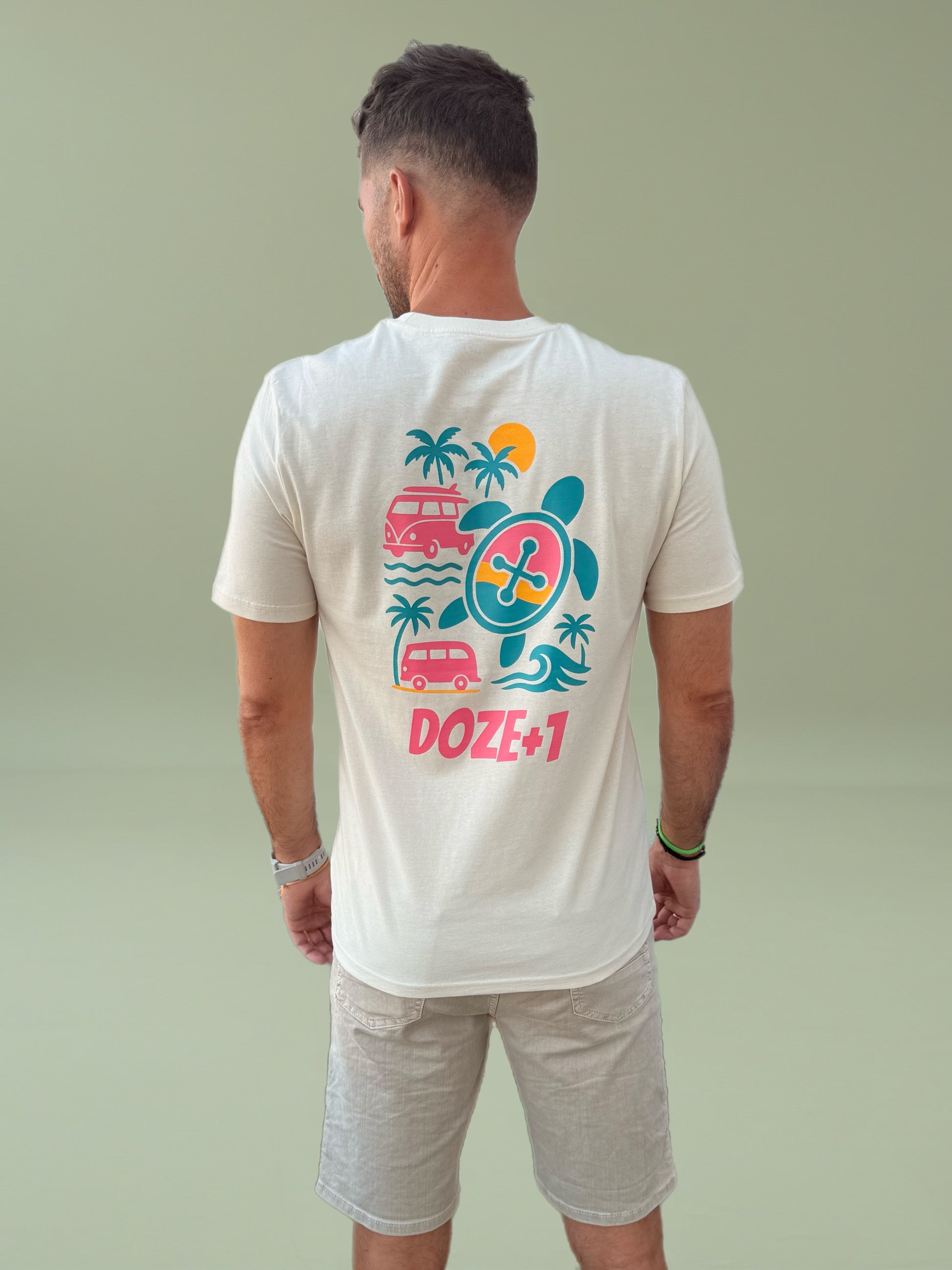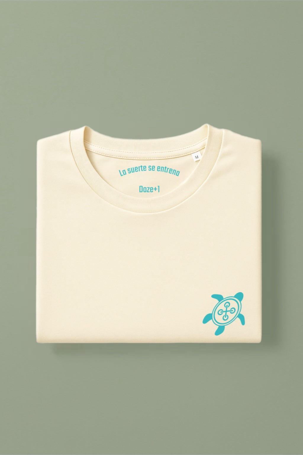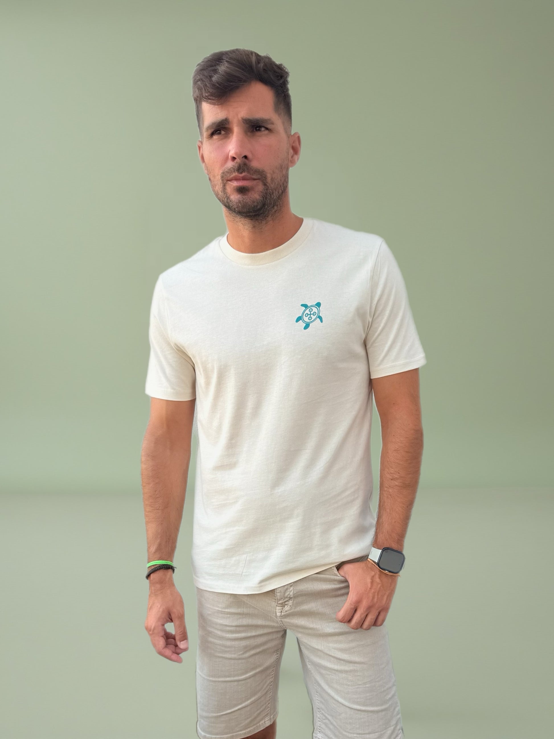 Confeccionada en algodón orgánico de alta calidad, en su forma más pura y con un peso de 180GSM, presenta nuestro logo original de la tortuga —con el icónico botón en el caparazón— en azul turquesa, un contraste que destaca sin gritar.